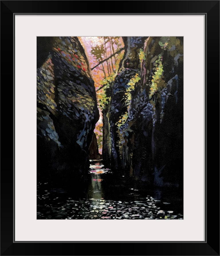<p>Light is the simple driver in this piece. The warm sun at the top is bleeding through the canyon water and highlighting the ferns on the canyon walls. Simple strokes of colors form the rocks and the ripples on the water. The trees in the background silhouette in the bright sun and helps draw the eye down to the water.</p>