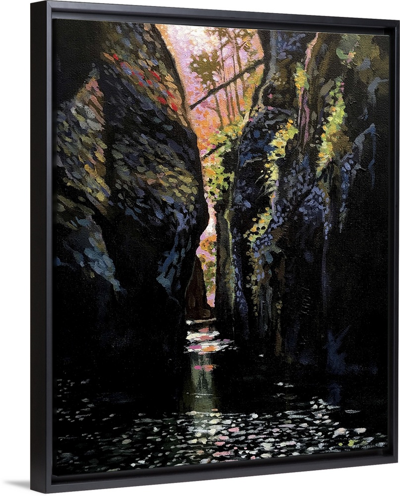 <p>Light is the simple driver in this piece. The warm sun at the top is bleeding through the canyon water and highlighting the ferns on the canyon walls. Simple strokes of colors form the rocks and the ripples on the water. The trees in the background silhouette in the bright sun and helps draw the eye down to the water.</p>