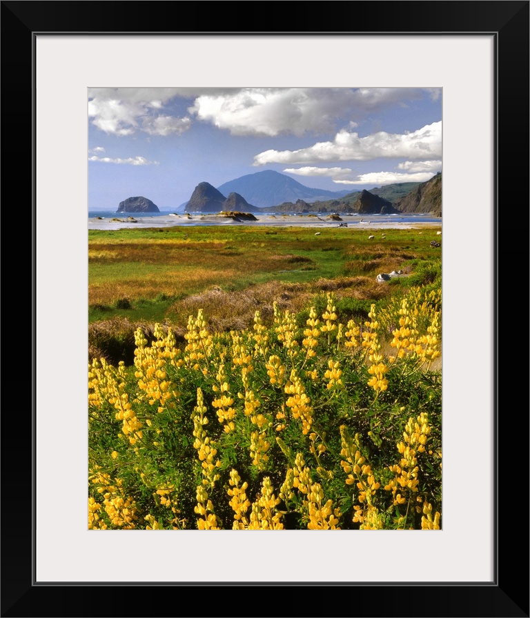 <p>USA, Oregon, Ophir. Landscape of yellow lupine and ocean beach.</p>