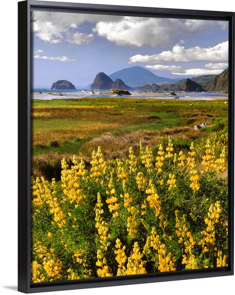 <p>USA, Oregon, Ophir. Landscape of yellow lupine and ocean beach.</p>