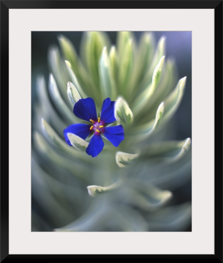 <p>USA, Oregon, Portland, Close-up of blue pimpernel bloom caught on euphorbia plant.</p>