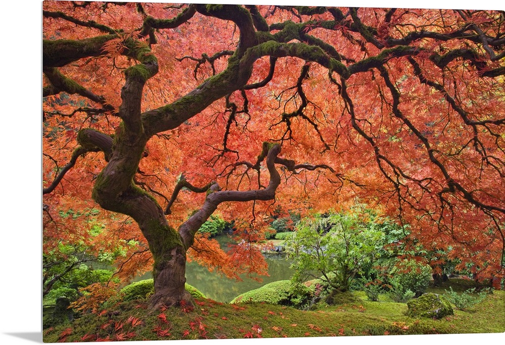 <p>USA, Oregon, Portland. Japanese maple tree next to pond at Portland Japanese Garden.</p>