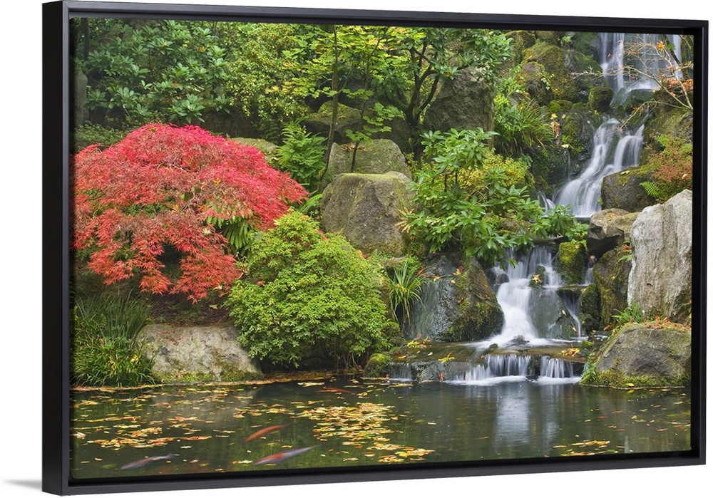 <p>USA, Oregon, Portland. Waterfall flows into koi pond at Portland Japanese Garden.</p>