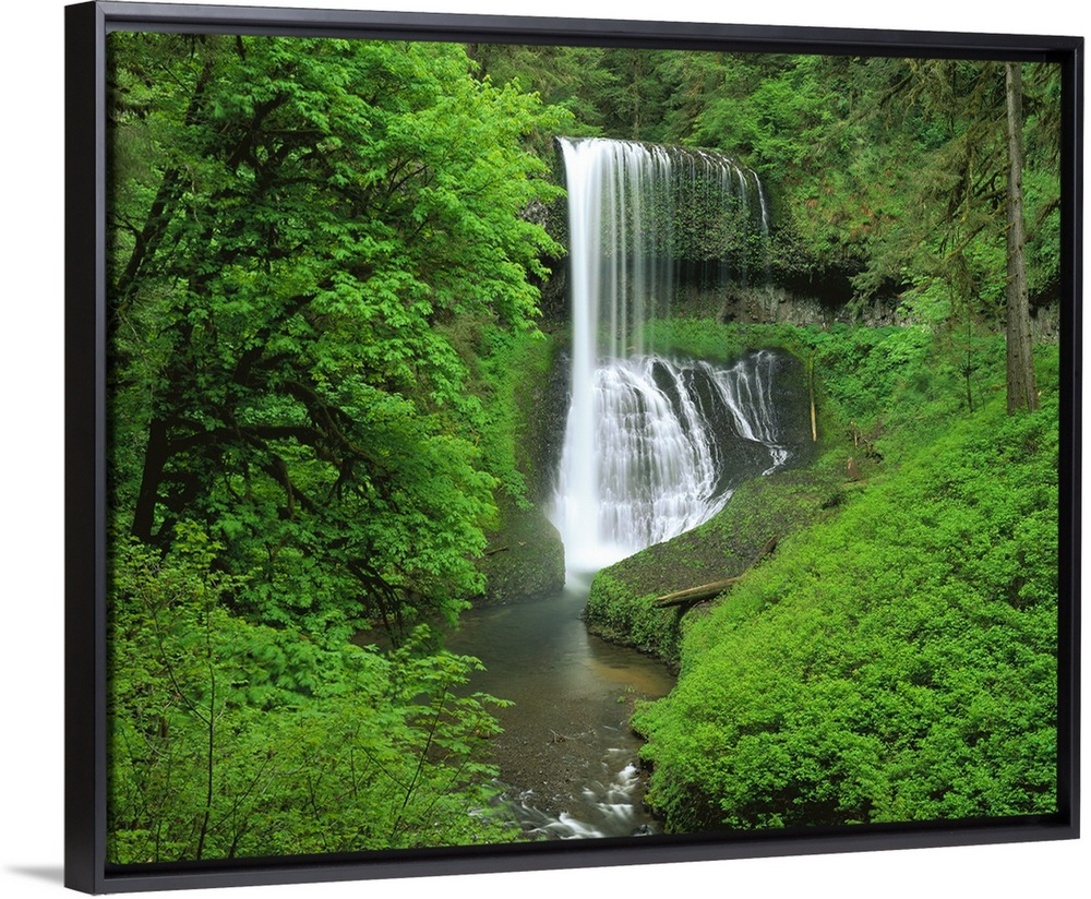 <p>Huge photograph of a dense forest within the Western United States showcases water cascading over the side and running down a large jagged cliff into a slow-moving stream below. The uneven stream of water falling down is heavier on the left hand side of the cliff.</p>
