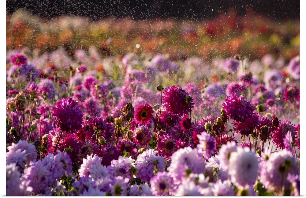 <p>USA, Oregon, Wilsonville, dahlia field with water coming down like rain showers as they water the plants.</p>