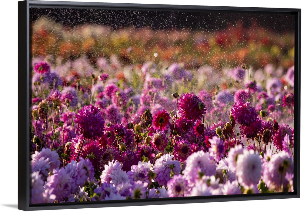 <p>USA, Oregon, Wilsonville, dahlia field with water coming down like rain showers as they water the plants.</p>