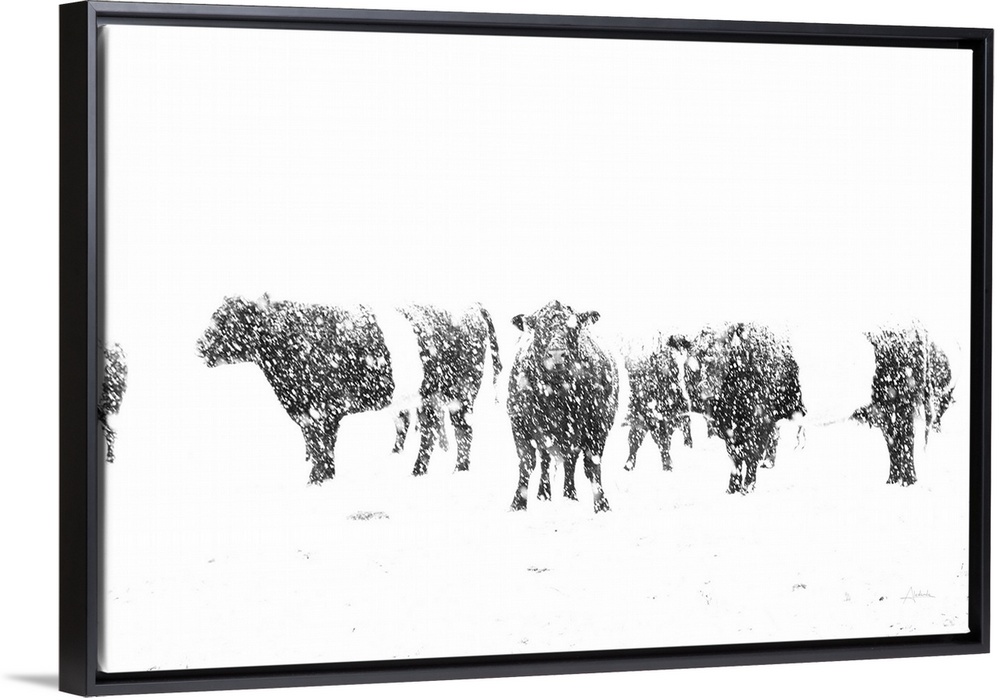 <p>In this photograph, black cows contrast an all white snowy landscape.</p>