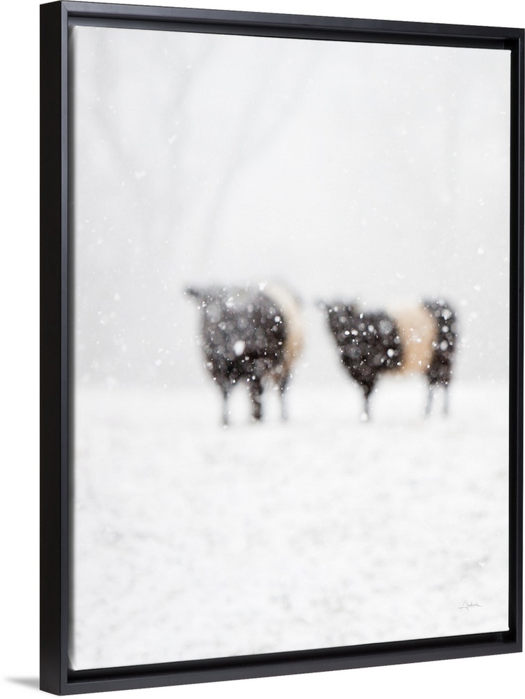 <p>Artistic photograph of two cows standing in a snowy field with prominent blurring throughout.</p>