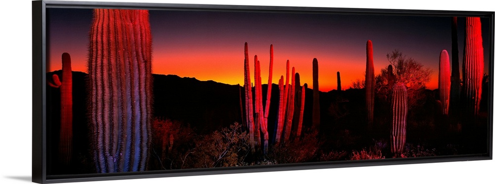 <p>Cactuses catching the fading light in this panoramic photograph of this desert sunset.</p>