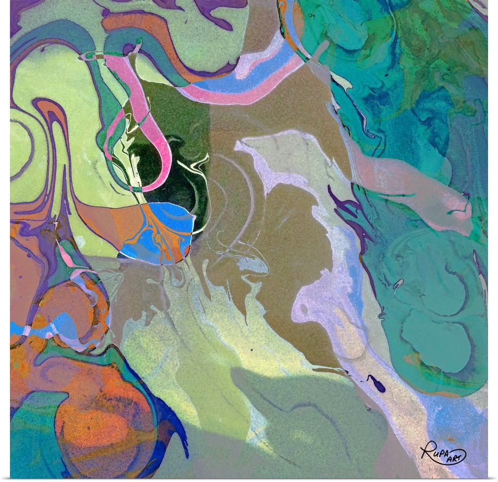 <p>Square abstract art with cool tones marbling together and made up of small, faint blotches of color.</p>