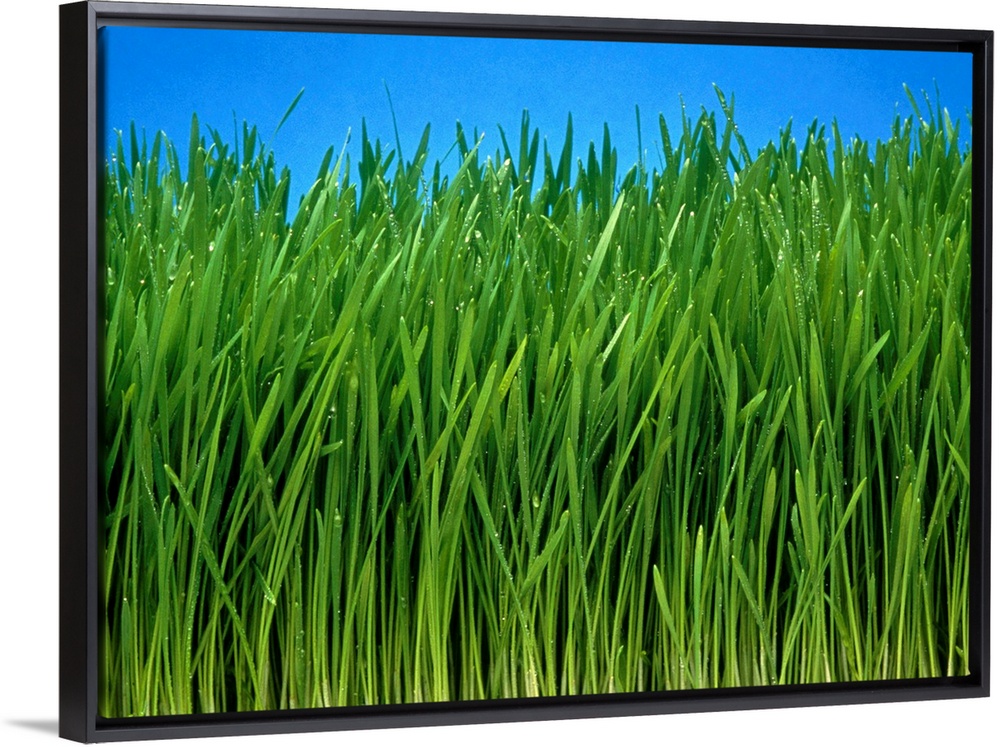 <p>Wheat grass. Field of organically grown wheat grass (Triticum sp.). Wheat is one of the world's most important crops, used to make flour for bread and pasta. Wheat grass is young wheat. It can be used for juices and other food supplements as it is high in vitamins and minerals. Organically grown crops have not had agricultural chemicals applied to them to increase their size or control pests. Photographed in Canada.</p>