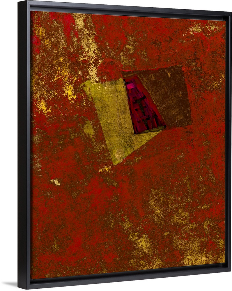 <p>An abstract expressionist image of shimmering textures and shapes in golds and crimson red.</p>