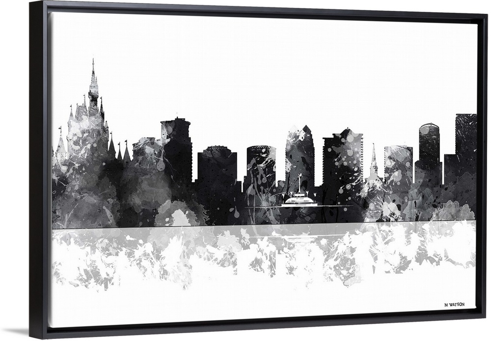 <p>Contemporary black and white watercolor skyline casting a mirror-like reflection below.</p>