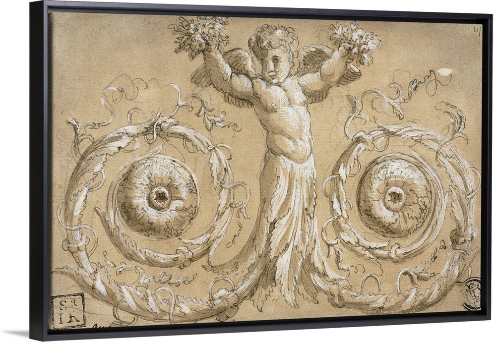 <p>Ornamental decoration, pen and brown ink, with brush and brown wash, heightened with white gouache, over traces of graphite, on buff laid paper, laid down on ivory laid paper.</p>