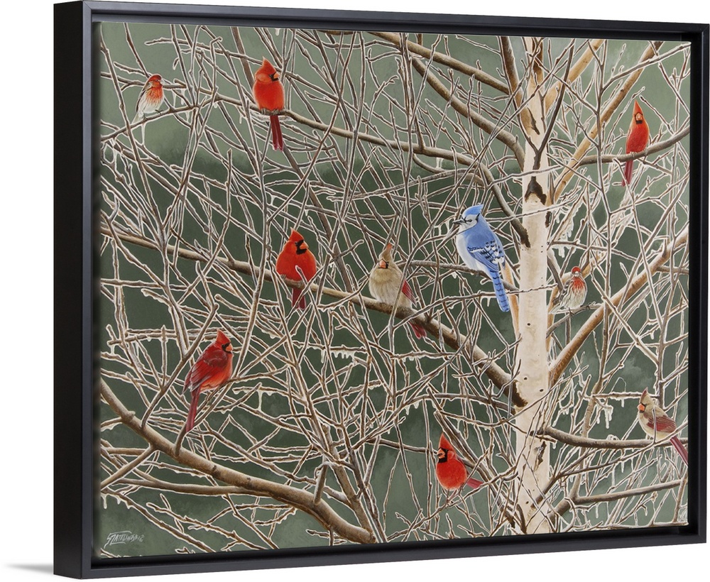 <p>Contemporary painting of several cardinals and a blue jay sitting in a bare tree, resembling Christmas ornaments.</p>