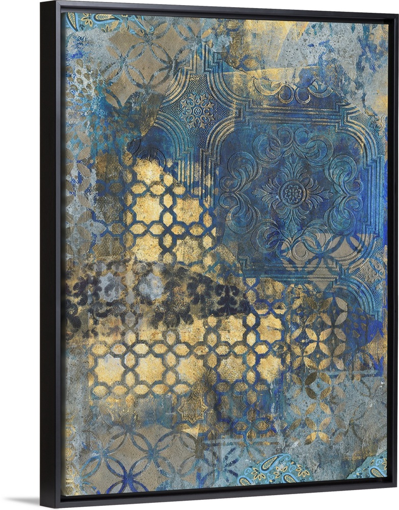 <p>Contemporary pattern home decor artwork of gold ornate patterns against a dark blue background.</p>