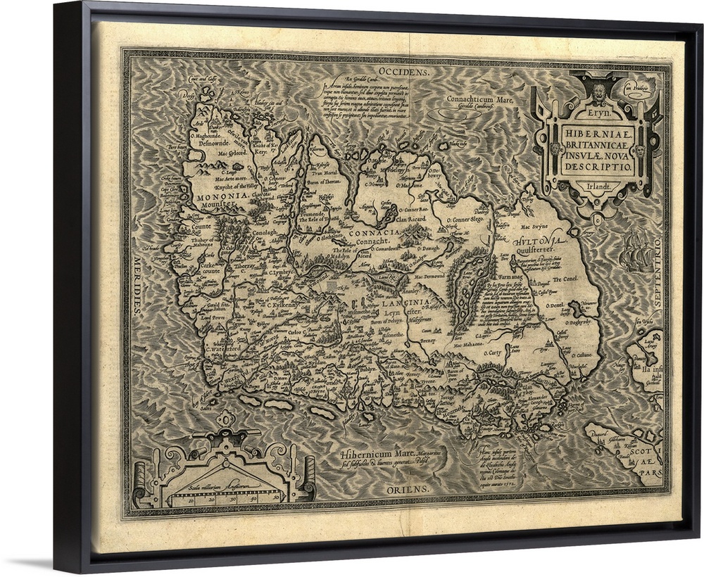 <p>Ortelius's map of Ireland, from an atlas of 1598. North is at right. This map is titled: Hiberniae, Britannicae Insulae Nova Descriptio (A new depiction of Ireland, a British Isle). It is based on Mercator's 1564 map. The map text is in Latin and mentions Queen Elizabeth I of England, who was also Queen of Ireland. Quotes are also given from the scholar Gyraldus Cambrensis (Gerald of Wales), coning the isles of Arran, Saint Patrick's Purgatory, and Lacus Erno (Lough Erne). A scale is at lower left. Abraham Ortelius (1527-1598) was a Flemish mapmaker who is considered to have produced the first true atlas (collection of uniform maps in one book).</p>