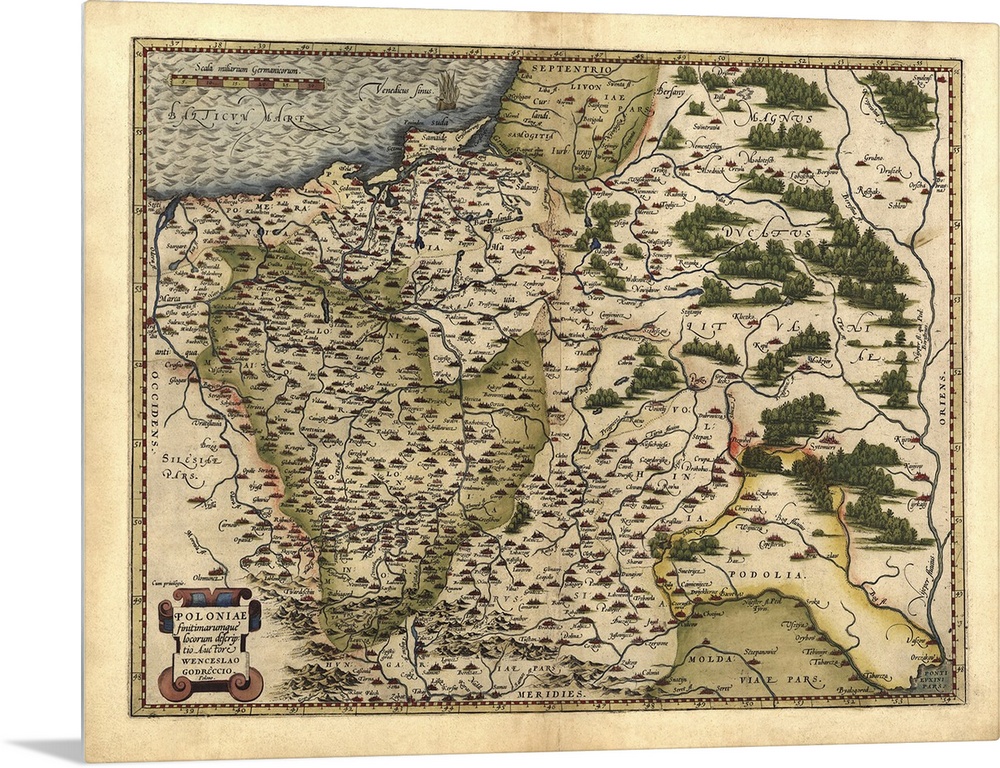 <p>Ortelius's map of Poland. This map is from the 1570 first edition of Theatrum orbis terrarum ('Theatre of the World'). Drawn by the Flemish mapmaker Abraham Ortelius (1527-1598), and published by Gilles Coppens de Diest in Antwerp, this collection of 53 maps is considered to be the first true modern atlas.</p>