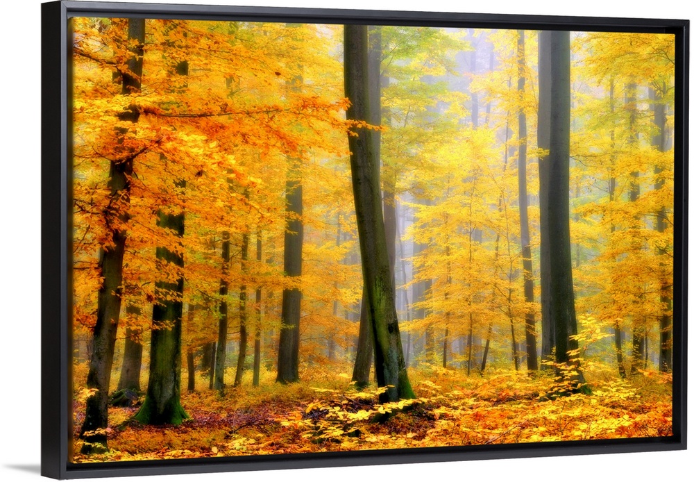 <p>Soft focus fine art photograph of a forest with tall trees covered in Fall colored bright yellow leaves glowing in the sun.</p>
