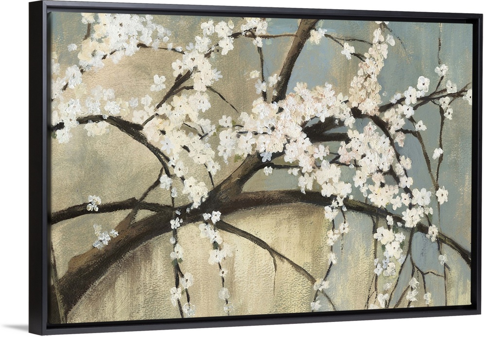 <p>Contemporary painting of little white flowers in bloom on the branches of a tree.</p>