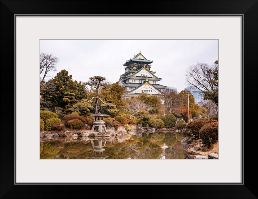 <p>Osaka Castle in Japan Reflecting in a Pond of a japanese Castle. Autumnal Colors in Winter</p>