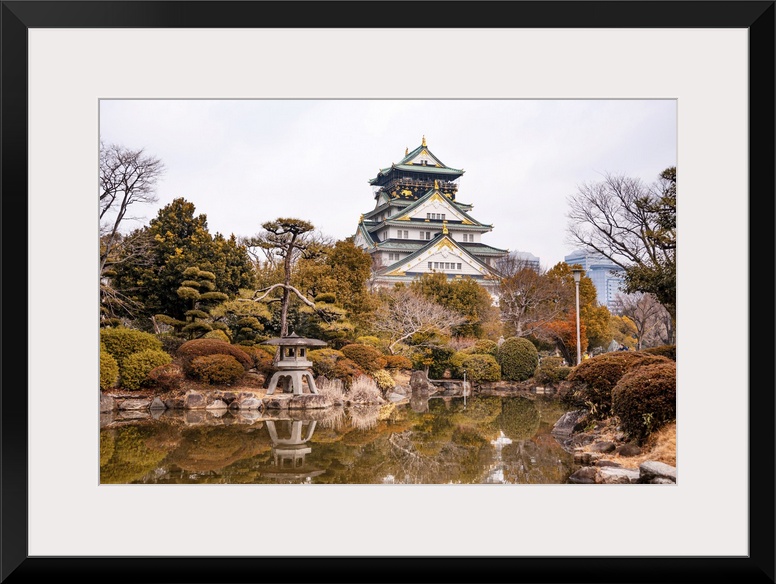 <p>Osaka Castle in Japan Reflecting in a Pond of a japanese Castle. Autumnal Colors in Winter</p>