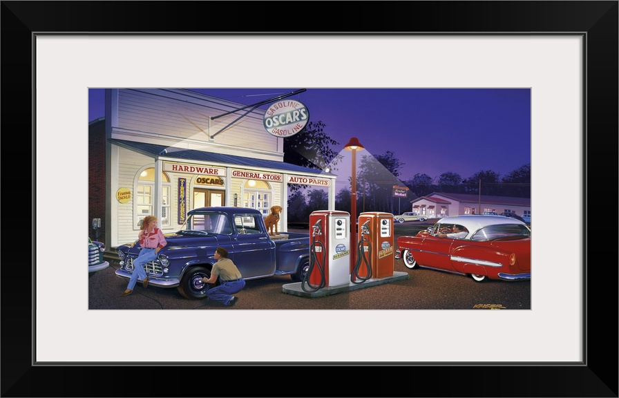 <p>Landscape, large wall picture of a small town general store and gas station in the late 1950s, lit up at night. A 1955 Chevy pickup truck and a 1953 Chevy custom in the parking lot.</p>