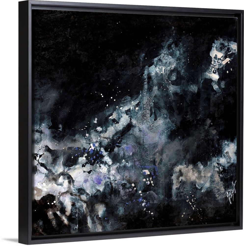 <p>This wall art is an abstract painting created by ink wash applications of paints to create star like shapes and splatters over the dark areas.</p>