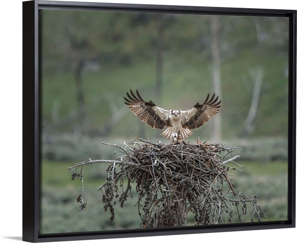 <p>Photograph of an osprey making a landing to its nest where its chick waits eagerly for food.</p>