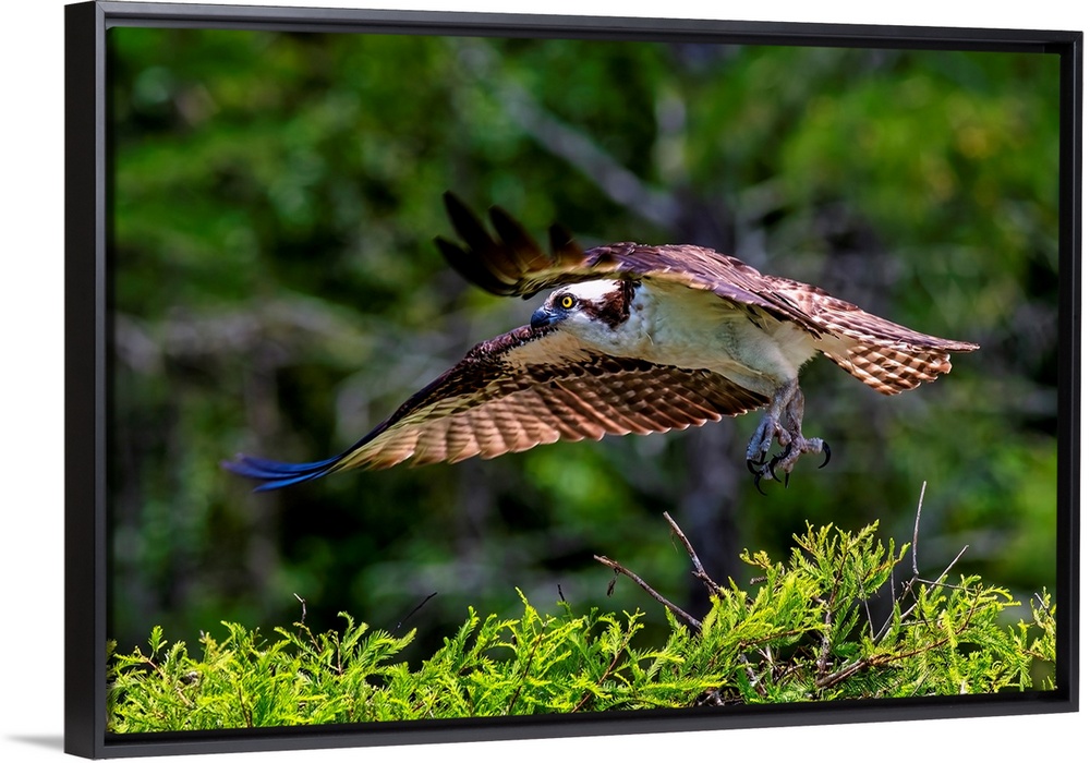 <p>An osprey spreads its wings as it lifts off from its nest atop a cypress tree along the edge of Lake Eufaula in Alabama.</p>