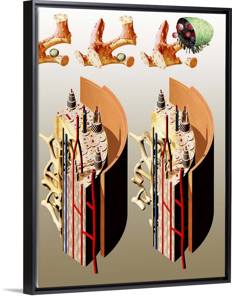 <p>Osteoporosis. Computer artwork showing the anatomy of normal (left) and osteoporotic (right) bone. A bone shaft consists of an outer layer of compact bone made up of cylindrical units called osteons. This layer surrounds the honey-combed interior of spongy (cancellous) bone. In osteoporosis, it is the loss of the structural strength of spongy bone that causes brittle bones to snap. Across top, the sequence shows an osteoclast (green, a type of bone cell) destroying one of the linking supports of spongy bone tissue. Excess bone resorption can lead to osteoporosis. The osteoclast secretes acid granules (red, upper right) to dissolve the bone.</p>