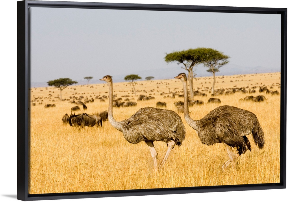 <p>Female ostriches (Struthio camelus) cross the Serengeti plains with Wildebeests in Serengeti National Park.</p>