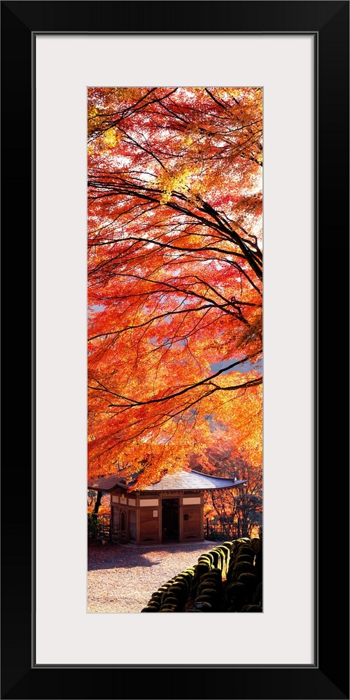 <p>Tall and narrow photo on canvas of brightly colored trees in Japan with a small temple below.</p>