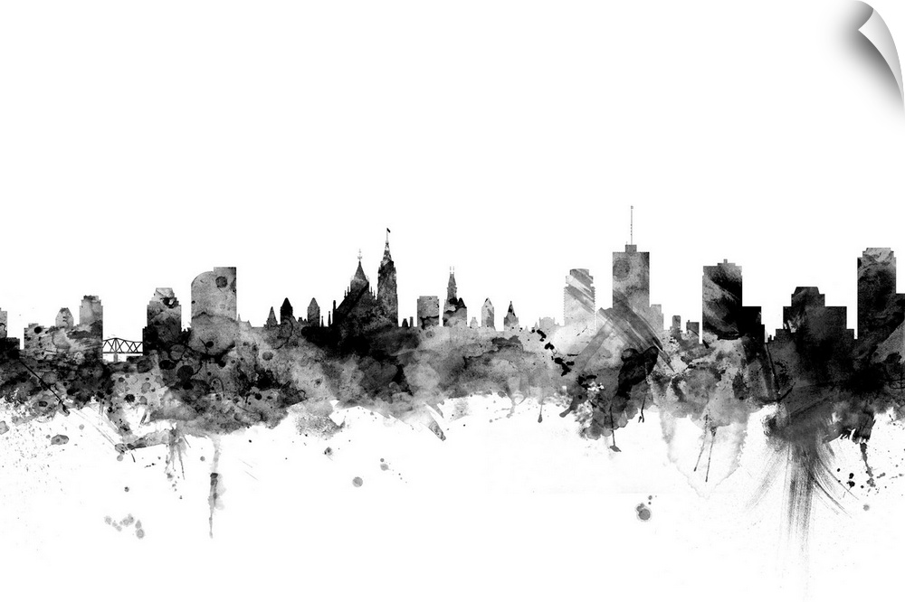 <p>Contemporary artwork of the Ottawa city skyline in black watercolor paint splashes.</p>