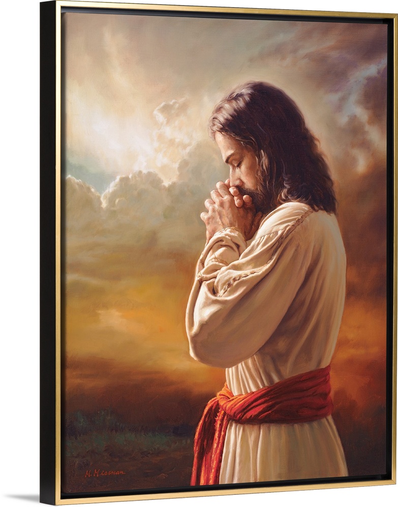<p>Fine art painting of Jesus praying in front of a sunset while wearing a red belt.</p>