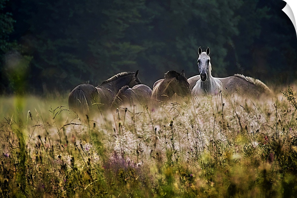 <p>A herd of horses with one alert white horse grazing in a field of wildflowers.</p>
