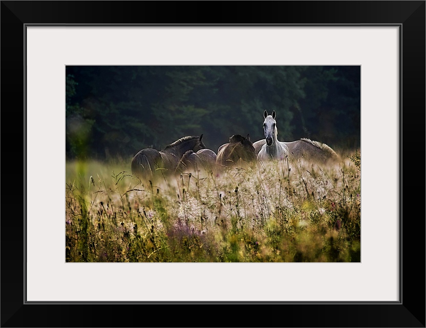 <p>A herd of horses with one alert white horse grazing in a field of wildflowers.</p>