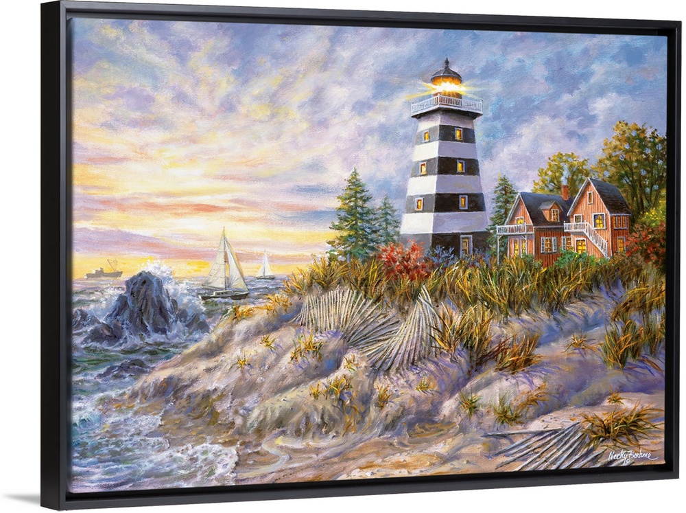 <p>Painting of lighthouse scene featuring glowing windows. Product is a painting reproduction only, and does not contain actual lights.</p>
