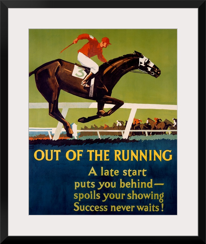 <p>This antique artwork shows an illustration horse and jockey far behind the rest of the racers. The text at the bottom of the poster could be an inspirational poster with the message oSuccess never waits!o</p>