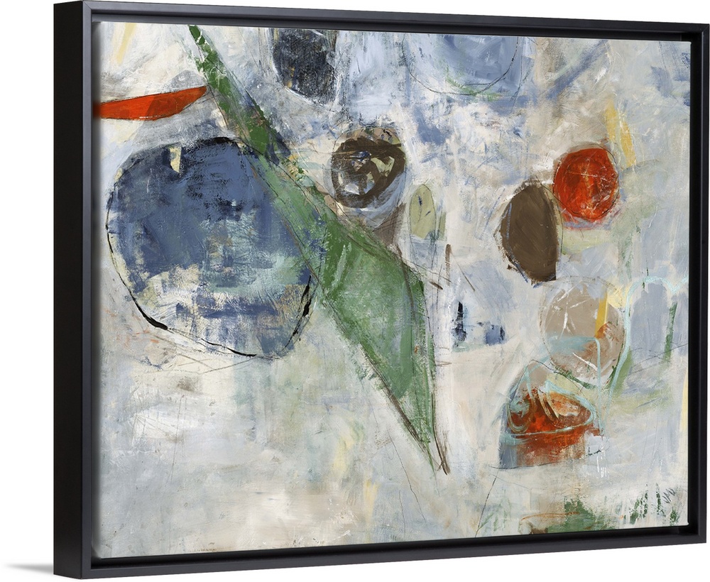 <p>Contemporary abstract painting using muted multi-colored organic shapes against a neutral toned background.</p>