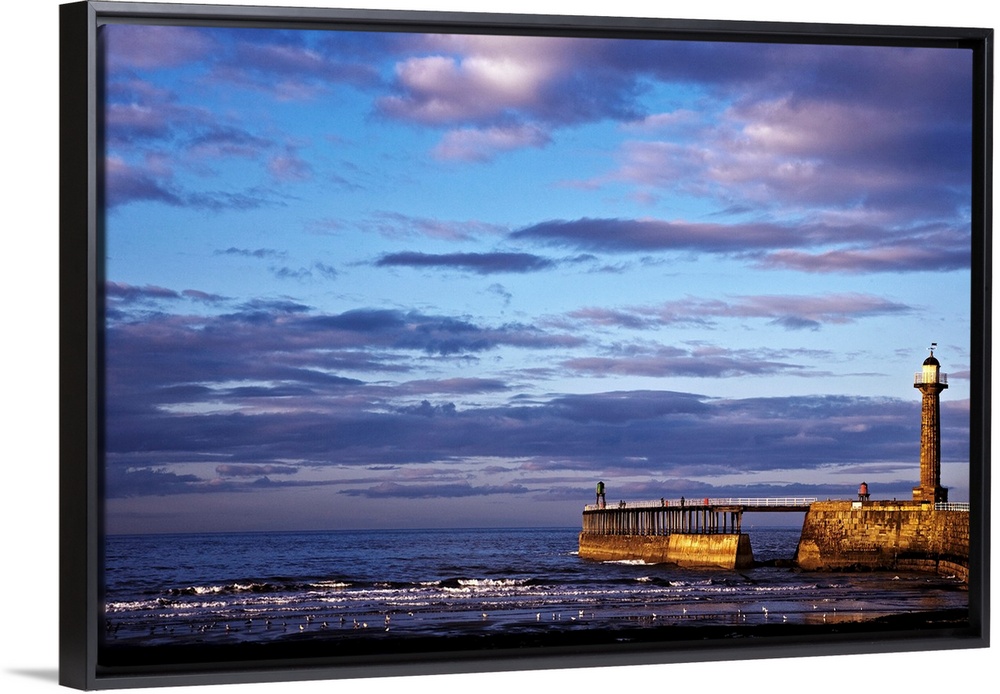 <p>Photograph taken overlooking the ocean with a small pier and lighthouse pictured just to the right.</p>