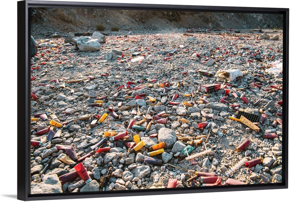 <p>Close up view of shotgun shells and other ammunition littered near Joshua Tree National Park, California.</p>