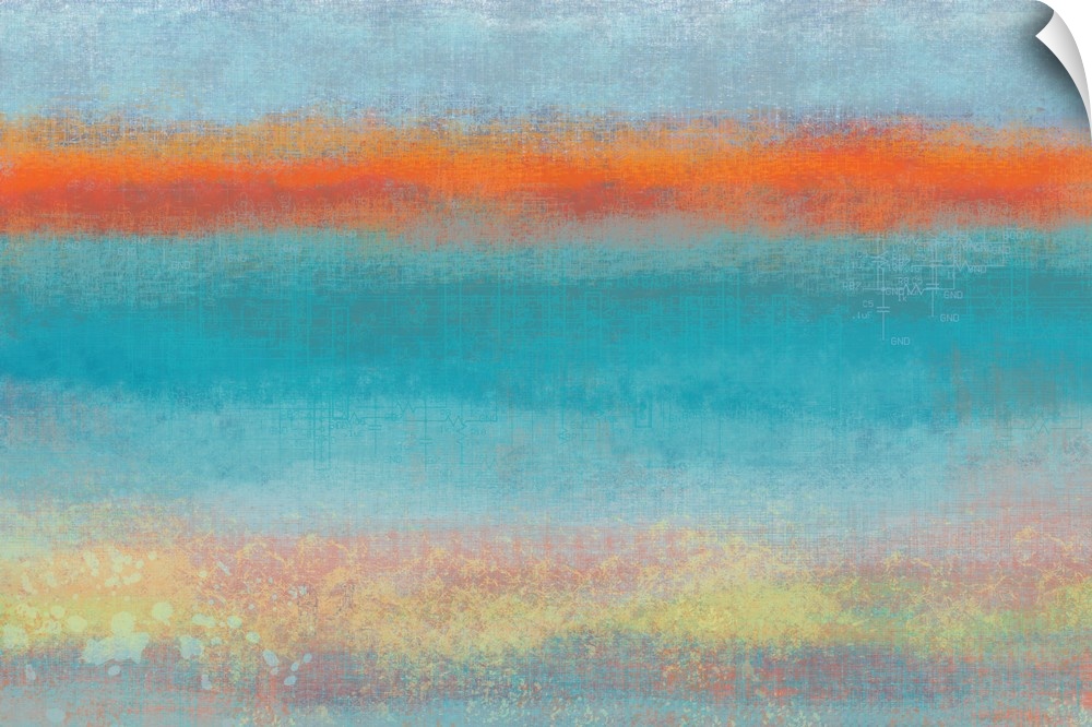 <p>Contemporary abstract painting of horizontal layers of blue and purple, separated by orange.</p>