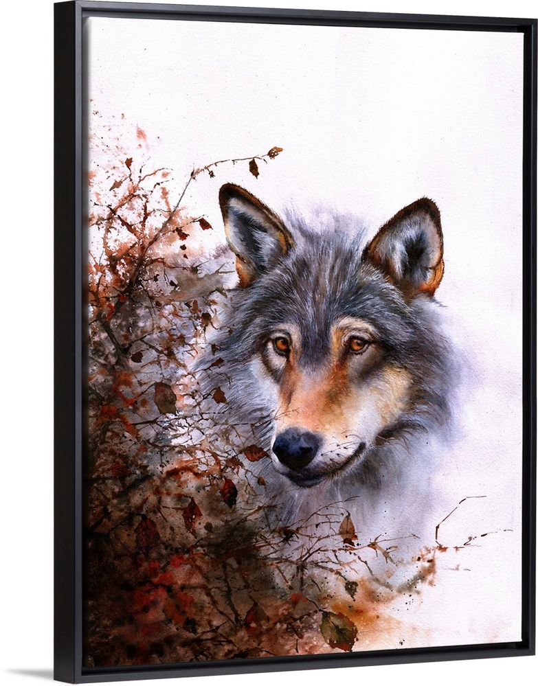 <p>A watercolour painting of a grey wolf behind a thorn bush.</p>