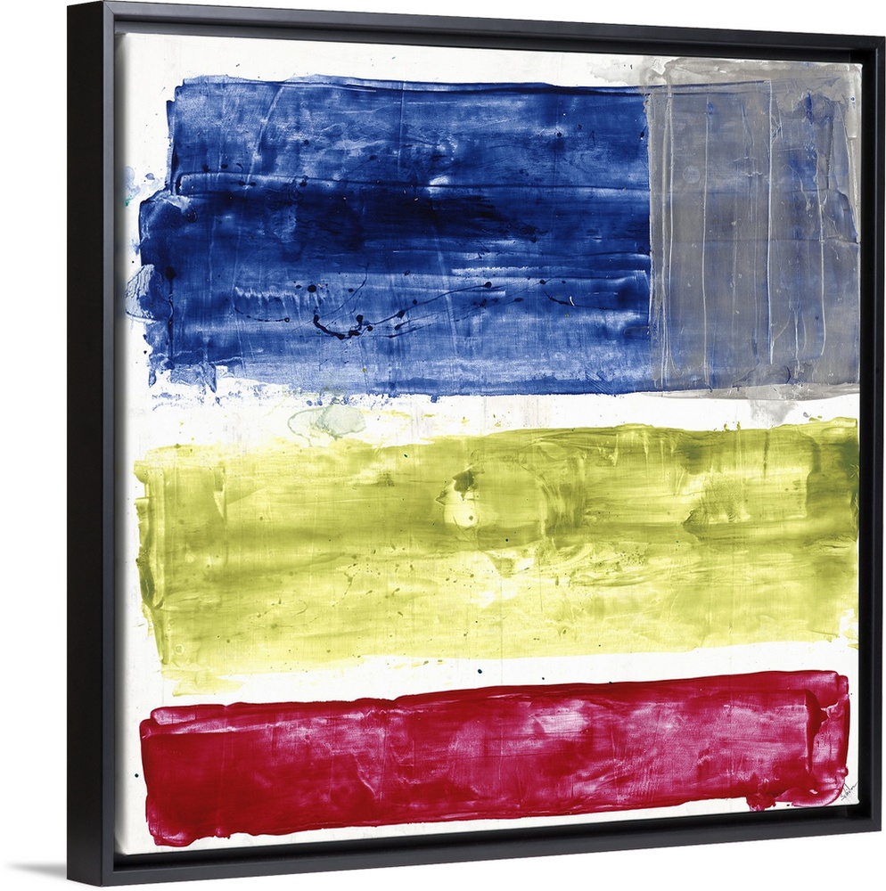 <p>Contemporary painting of three rectangular shapes in various thicknesses and color, vertically stacked on a light neutral background.</p>
