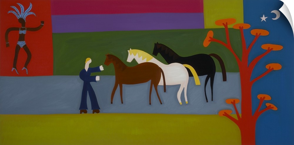<p>Contemporary painting of a person with three horses in a row.</p>