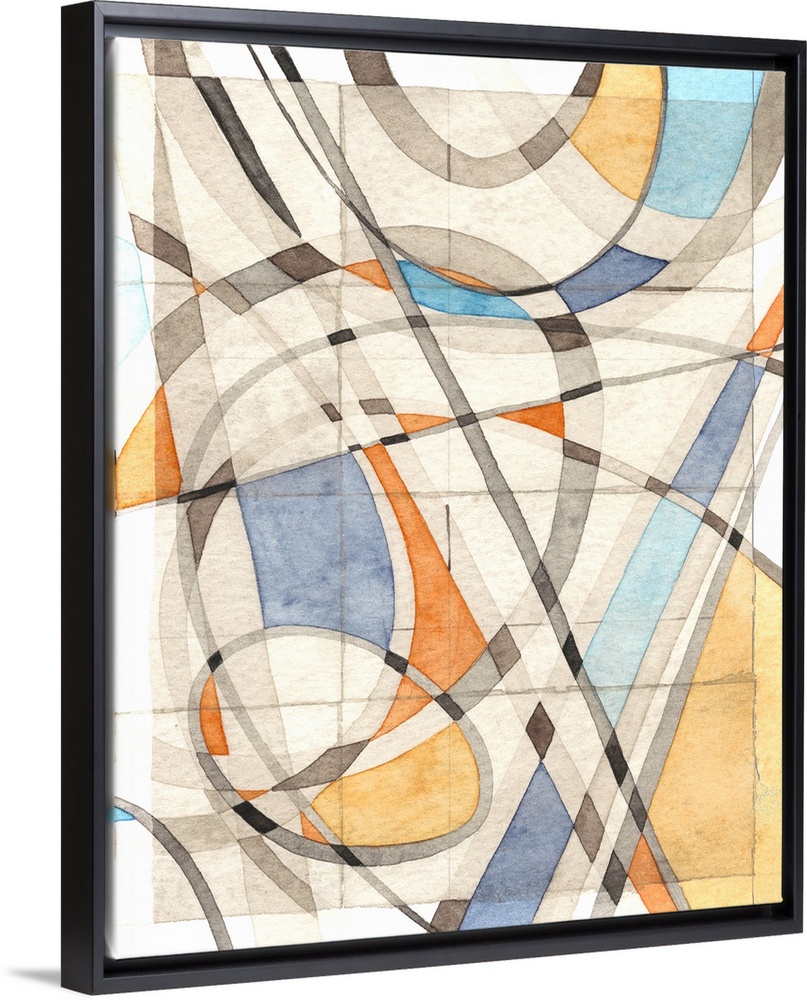 <p>Contemporary abstract artwork using thin bold lines in overlapping criss crossing patterns with mixes of bright colors.</p>