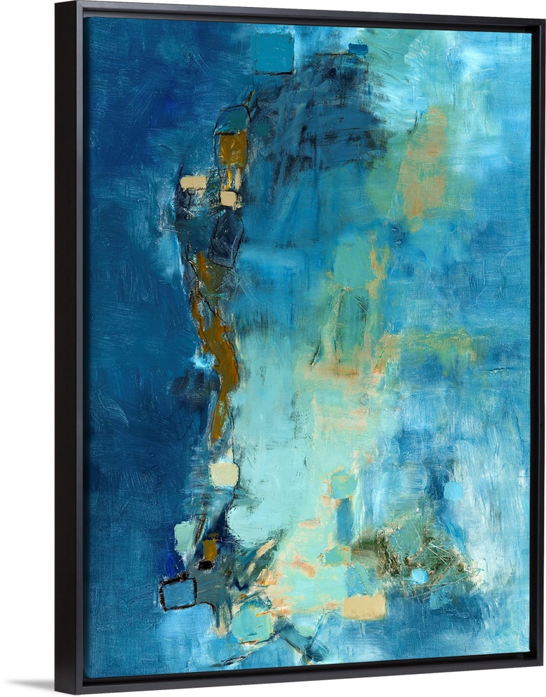 <p>Large abstract painting in blue, beige, and green hues.</p>