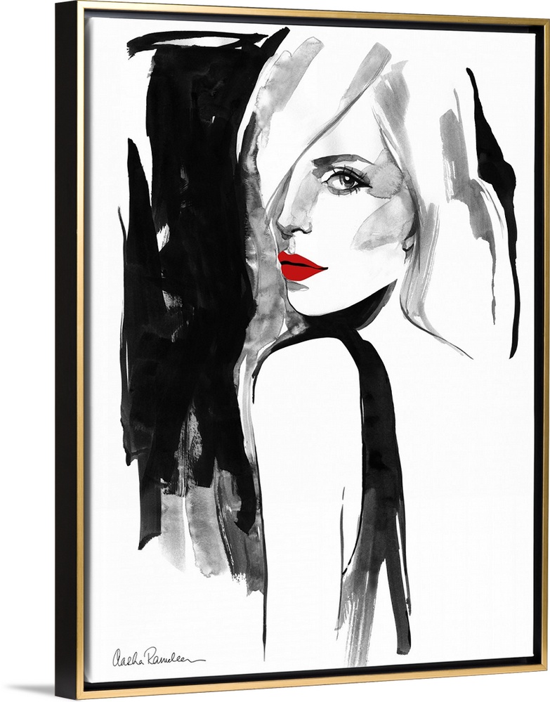 <p>Contemporary fashion artwork of a woman wearing bright red lipstick looking over her shoulder.</p>