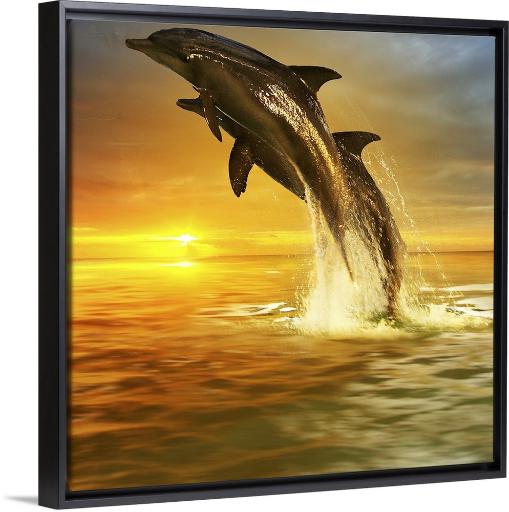 <p>Two Dolphins leaping out of the water, over the sunset on the horizon.</p>